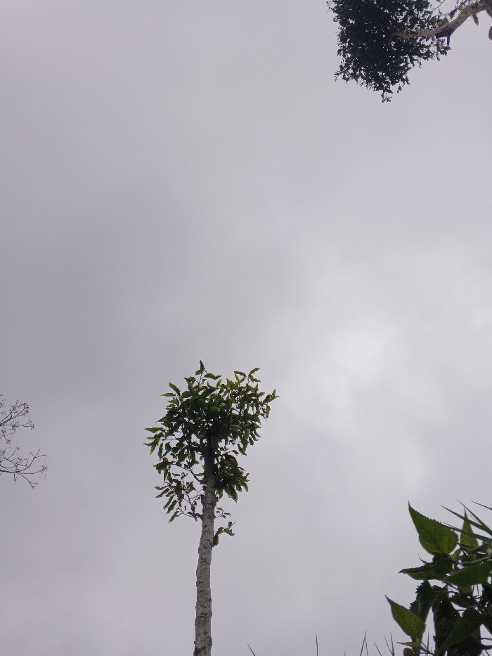 The image presents an upward perspective of an overcast sky over Pinnwe, Myanmar (Burma). The sky is a uniform light grey, indicating full cloud cover. Dominating the central foreground is a single, slender tree featuring a light-colored trunk with visible texture, culminating in a compact cluster of vibrant green leaves at its crown. In the upper right corner, a portion of a distinct tree's dense, dark green canopy and a segment of its branch are visible. On the far left, a sparse, bare branch with minimal reddish-brown buds or residual foliage extends into the frame. The bottom right edge reveals the tops of green plant leaves and stems, indicative of ground-level flora. No human figures or artificial structures are present within the frame.