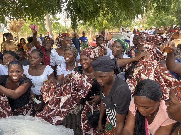 The image portrays an outdoor gathering of approximately thirty individuals, predominantly adult Black women, in Kalong, Nigeria