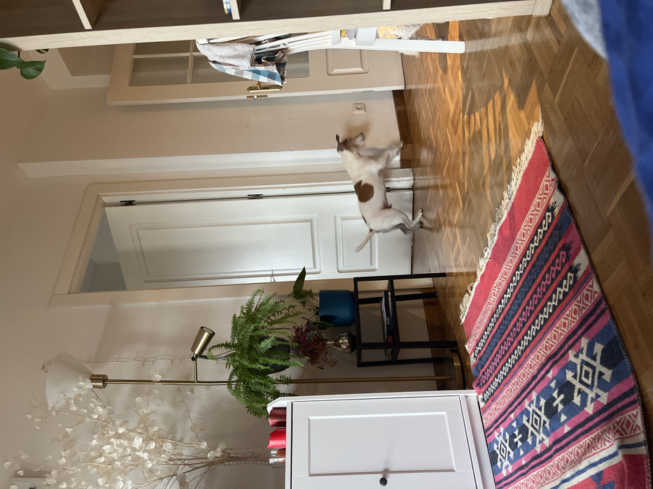 The image depicts a residential interior in Madrid, Spain, characterized by light-colored walls and polished parquet wood flooring. Natural light streams into the room, casting distinct shadows on the floor. In the foreground, a vibrant rectangular rug with geometric patterns in shades of pink, red, blue, black, and white covers a portion of the floor. To the left, a white two-door cabinet with black handles stands, topped with a clear vase holding white decorative branches and several red and metallic candle holders. Adjacent to the cabinet is a brass-colored floor lamp, featuring a white conical shade at the top and an adjustable spotlight on a lower arm. A large green fern plant hangs from the lamp's adjustable arm. Beneath the fern, a two-tiered black side table holds a metallic vase, a potted plant with dark red foliage, and a plant in a teal pot. Behind this table, a white paneled door is partially ajar, revealing a darker space beyond. A white dog, primarily white with brown patches on its back and head, is captured in mid-action in the center-right of the frame. The dog appears to be jumping or running towards the right, with its front paws elevated off the ground. Further to the right, a second white door, possibly featuring frosted glass panels in its upper section, is also partially open. A light-colored wooden bookcase is partially visible on the far right, alongside a white chair draped with a patterned fabric. String lights are affixed to the wall behind the floor lamp. No people are visible.