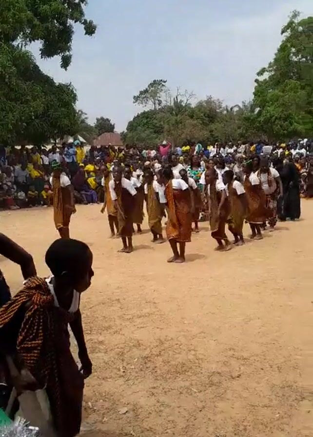 group of young women performing a traditional dance in an outdoor setting. The women are wearing matching brown and orange patterned dresses with white tops. They are dancing on a sandy area in front of a large crowd of people. A woman with a dark-blue striped dress carries a large bowl over her head while dancing. Another person wearing a patterned shawl stands in front of a table, observing the scene. The background features trees and a cloudy sky.