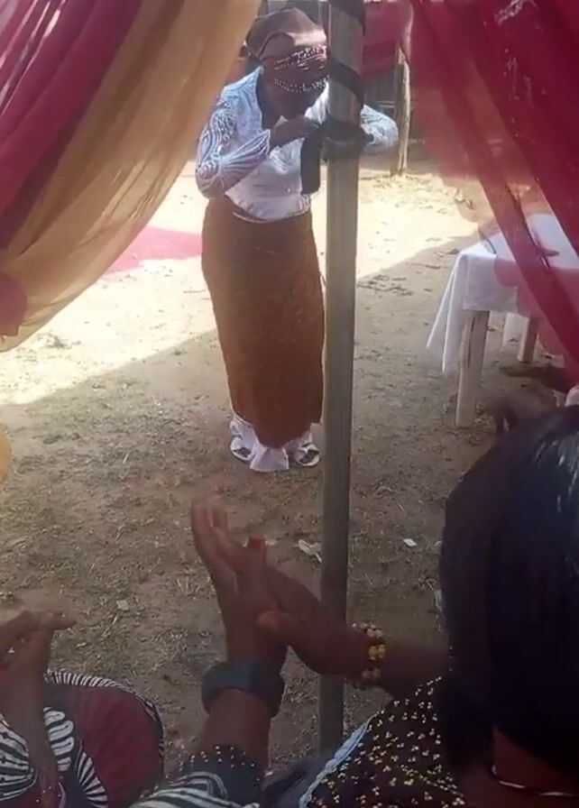 woman dancing blindfolded outside under a fabric-draped structure. She is wearing a white, long-sleeved shirt, a long brown patterned skirt, white shoes and a brown headscarf with a blindfold. People are seated and clapping, suggesting that they are enjoying her dance. A white table is visible behind her. The ground is dirt. The structure is supported by a dark post. The scene appears to be a festive outdoor gathering, possibly a celebration or ceremony.