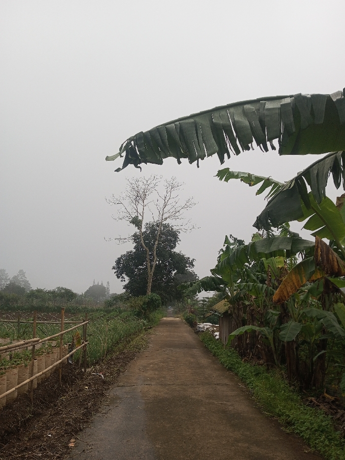 The image depicts a rural or semi-rural pathway in Joshi Vihir, India, under an overcast sky with significant atmospheric haze or fog. No individuals are present. In the foreground, a wide, textured banana leaf with torn edges hangs down from the upper right, partially obscuring the sky. Below it, a dense cluster of banana plants with large green and some browning leaves line the right side of a narrow, unpaved or dirt path. A small, unpainted wooden structure with a corrugated tin roof is visible behind the banana plants on the right. The path, appearing damp and dark grey, extends centrally into the distance, narrowing as it recedes. On the left side of the path, a low, rudimentary fence constructed from bamboo poles is visible. Behind this fence, several white or light-colored grow bags or containers are arranged in a row, likely containing cultivated plants. Beyond these, a cultivated field with rows of green vegetation extends into the midground. In the midground, a tall, slender tree with numerous bare branches stands prominently on the left side of the path, backed by a tree with dark green foliage. The background shows indistinct silhouettes of trees and distant terrain, heavily obscured by the widespread atmospheric haze. The overall lighting is diffuse, consistent with an overcast or foggy condition.