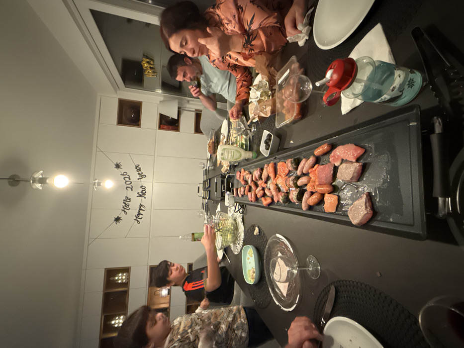 A family gathers around a long table for a meal, with a grill in the center loaded with meat and sausages. Three people are visible on one side, including a woman in a floral shirt and a man with a drink. On the opposite side, a boy in a black shirt is visible, along with another person in a patterned shirt. Table settings with plates, glasses, and cutlery are visible, and a "Hello 2026 Happy New Year" decoration adorns the wall.