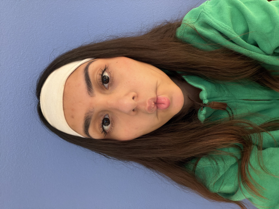 The image features a close-up portrait of a female individual. The location cannot be determined from the visual information provided and is not identifiable as Copenhagen, Denmark. The subject has long, dark brown hair, parted centrally and held back by a wide, cream-colored fabric headband. She has an olive skin tone, dark brown eyes, and prominent dark eyebrows. Her lips are tightly pursed into a 'fish face' expression, and her gaze is directed straight at the camera. She is wearing a bright green, textured zippered jacket with a high, ruffled collar. A small, dark brown tassel is attached to the zipper pull. The background is a plain, solid blue surface, likely a wall.