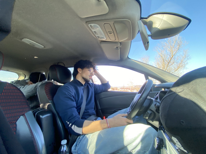 The image depicts the interior of a vehicle during daylight hours under a clear blue sky, identified as being in Dolna Banya, Bulgaria. A male driver, with dark curly hair and glasses, is seated, wearing a dark blue long-sleeved polo shirt and light blue jeans, secured by a seatbelt. His right hand rests on the steering wheel, while his left hand is positioned near his head, and he is looking out the driver's side window. A red beaded bracelet is visible on his right wrist. A clear plastic water bottle with a blue cap is located on the floor in front of the driver's seat. In the backseat, behind the driver, another individual is partially visible, appearing to be resting or sleeping, covered by grey fabric. A portion of a third individual, presumed to be the front passenger, is visible in the lower right foreground, including an arm and part of a black baseball cap. Through the car windows, bare trees and distant buildings are discernible under bright sunlight. The car's interior features include a dark dashboard, rearview mirror, and dark seats with a red patterned insert.