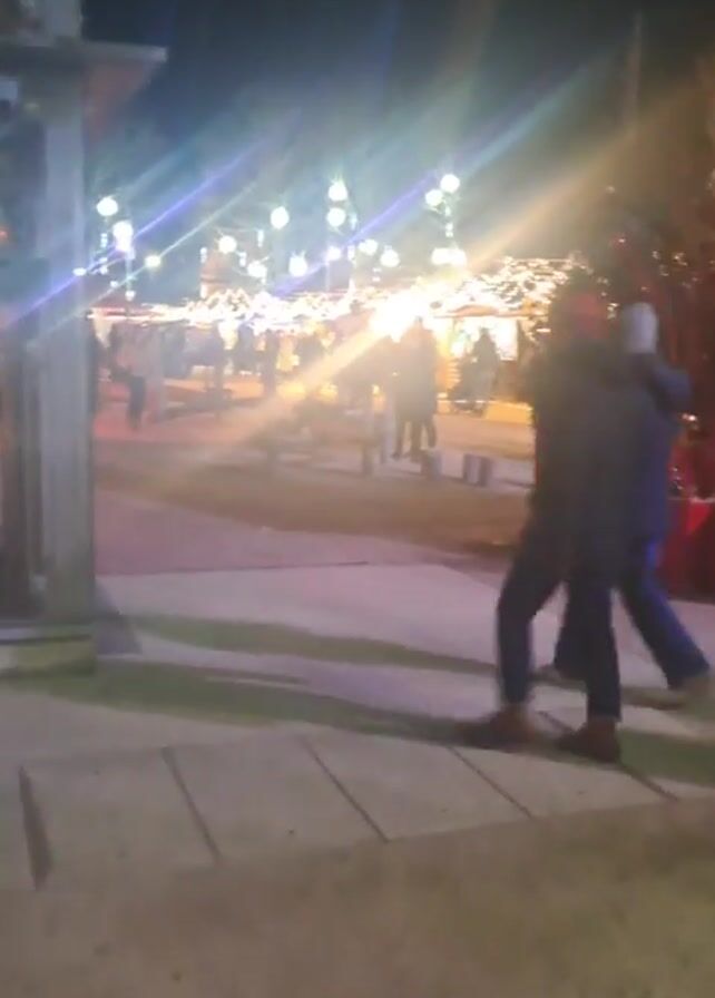 At night, a poorly lit outdoor scene shows a section of a Christmas market. Several people walk past and linger in the background. A wooden frame structure with red planters containing bare trees decorated with lights stands along a walkway. A sign with the word "Publique" can be seen on a structure in the foreground. The lighting is bright and creates glare.