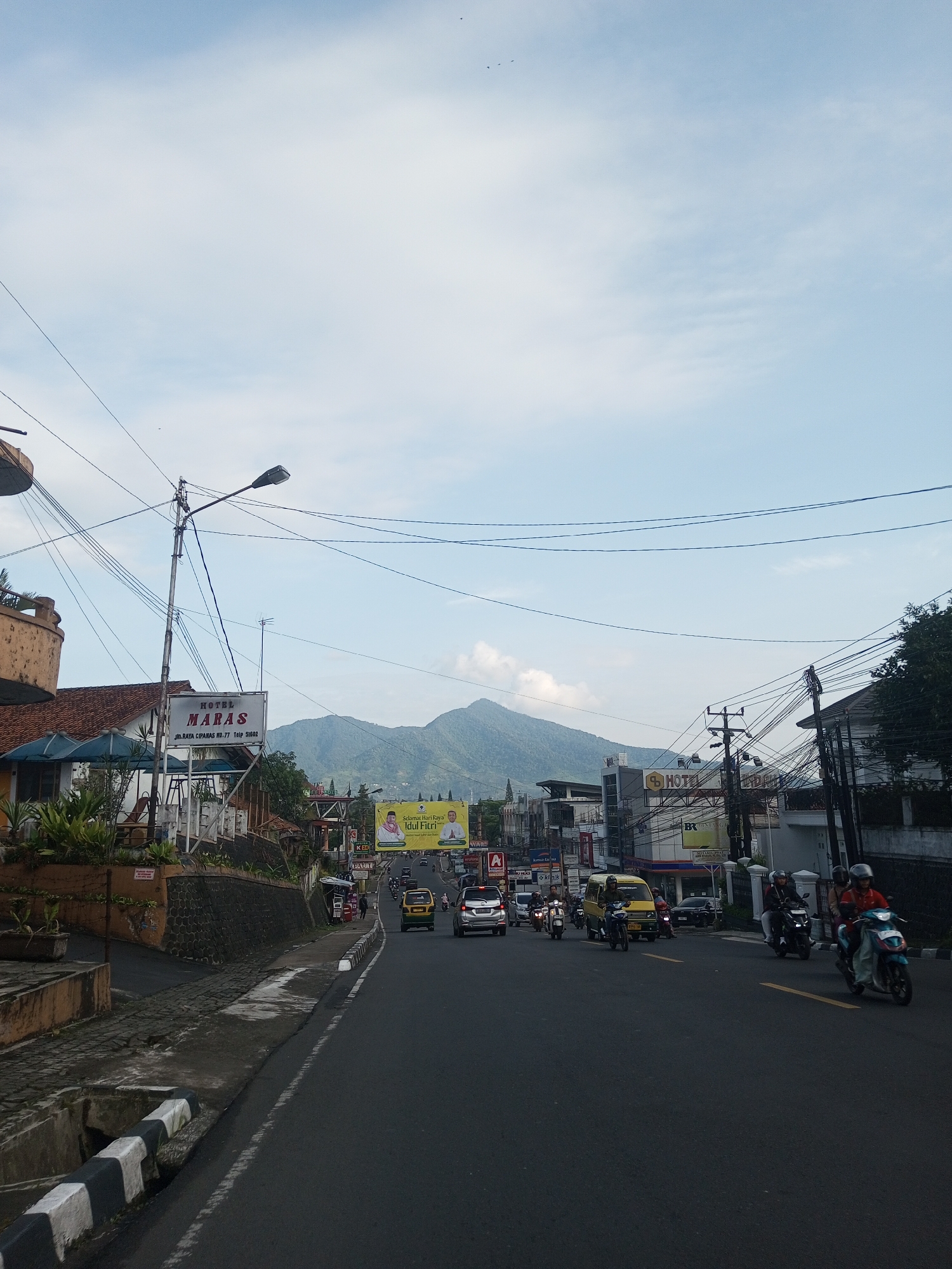 The image depicts a street scene in what appears to be a town or city in a tropical or subtropical region. The street is asphalt, and there is a black and white painted curb along the left side of the road. There are cars, motorcycles, and vans on the road, moving in both directions. The sky is light blue with some wispy clouds. In the distance, there are mountains. Along both sides of the road, there are buildings of varying sizes and styles. There are utility poles and wires running across the sky above the street. A sign on the left side of the road reads "Hotel Maras". Another sign in the background displays a greeting "Selamat Hari Raya Idul Fitri". The image is not in the city of Mya Sit Kaing Ywar Thit, Myanmar. It is in Indonesia.