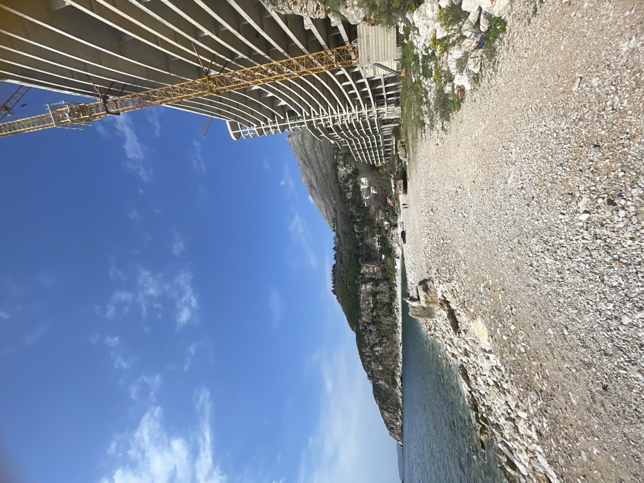 The image depicts a coastal scene in Perazića Do, Montenegro, under a clear blue sky with scattered white clouds. The foreground and midground feature a wide, light-colored pebble beach and path, with larger rocks forming the immediate shoreline to the left. Calm, dark blue-green sea water occupies the left side of the frame, extending towards the horizon. On the right, a large, multi-story concrete building under construction dominates the midground and background, curving along the coastline. It is an unfinished structure with visible concrete floor slabs and support pillars. A tall, yellow tower crane is attached to the building's exterior, extending upwards and to the left. Another crane boom is visible further back on the structure. In the midground, towards the center-right on the gravel path, two individuals are visible walking away from the camera. Near them, two dark-colored vehicles are parked on the pebble surface, alongside a small, reddish-brown structure. Further left in the midground, a single individual is seated on a large, weathered concrete block at the water's edge, facing the sea. The background features a prominent, partially forested hill and mountain range rising from the coast. The upper sections of the mountains appear rocky, while the lower slopes closer to the beach show patches of green vegetation and some smaller structures. Green bushes and yellow-flowering plants are visible on the rocky ground immediately adjacent to the construction site on the right.