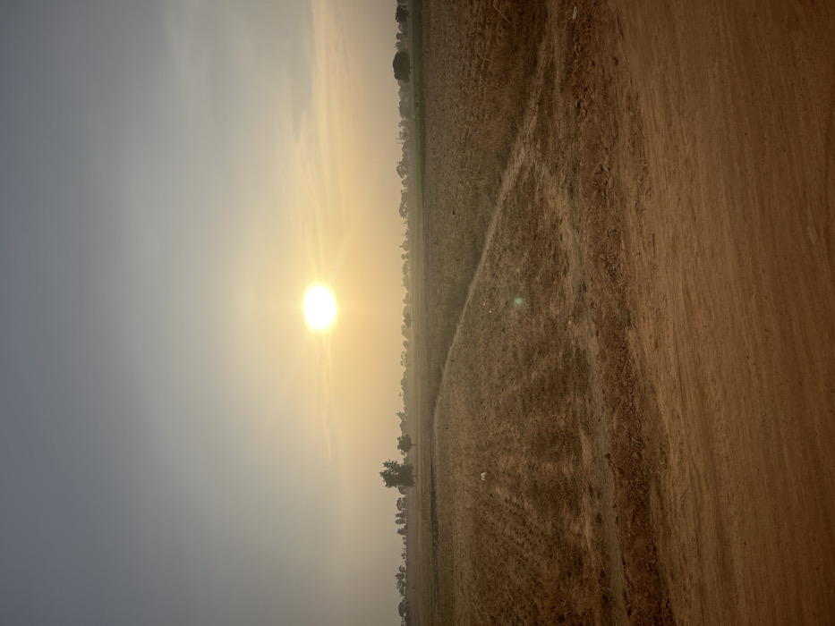 A landscape under a hazy sky, illuminated by the sun. The foreground features a field of dry grass or dirt. A line of trees or vegetation runs along the horizon. The sun appears as a bright, circular orb amidst the hazy atmosphere, casting a soft, warm light across the scene. The sky fades from light grey to a warmer tone near the sun. The image has an overall soft, muted quality.