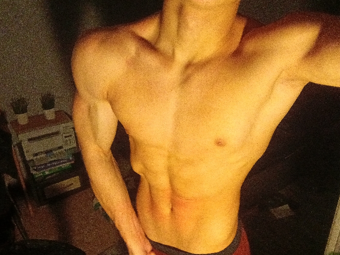 A close-up shot reveals a shirtless, muscular torso of a male figure