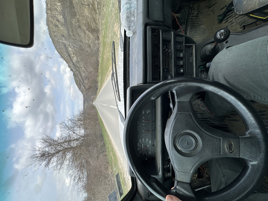An interior view from a Lada Niva vehicle, currently traveling on a paved road in the vicinity of Botrov, Bulgaria