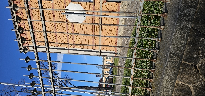 The image presents an outdoor urban scene in Kamenz - Kamjenc, Germany, under a clear blue sky. In the foreground, a weathered metal fence, consisting of grey vertical bars topped with decorative spiked finials, runs horizontally across the frame. The fence shows significant rust and discoloration, especially on its lower sections. It is mounted on a low, grey concrete wall, which rests upon larger, dark, irregularly shaped stone blocks. Behind the fence and concrete wall, a strip of low-lying green vegetation is visible. Further back, an unpaved or gravel area contains parked vehicles; a brown sedan and a lighter-colored SUV are partially visible. A blue square parking sign, displaying a white "P" symbol, is erected within this area. The background features several buildings. To the right, a prominent multi-story building constructed of light orange brick with dark mortar lines is visible, featuring a light-colored vertical trim element on its left side. A dark window on this building is partially obscured by a circular white object, possibly a fixture or sign. To the left of the brick building, a cluster of lighter-colored, one- to two-story buildings with arched windows is visible. A tall, deciduous tree with bare branches stands on the far left of the scene. The entire scene is illuminated by natural sunlight.
