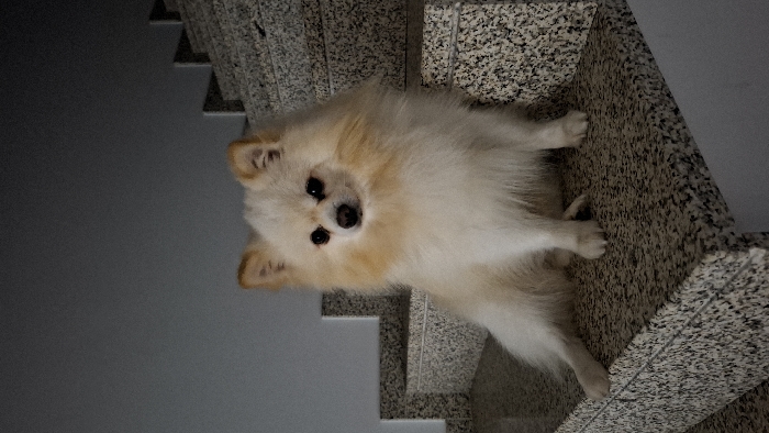 - "A cream-colored Pomeranian dog stands on a set of stairs with speckled stone steps" by FM-VH5CK2, licensed under CC BY 4.0