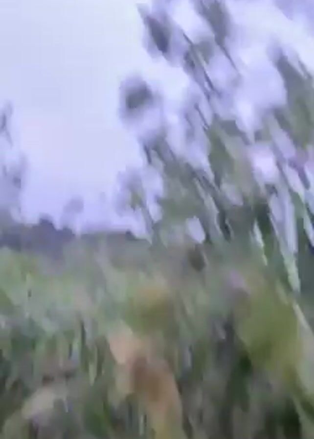 The video starts with a blurry view of green plants, then the camera quickly tilts upwards revealing an aircraft in the sky