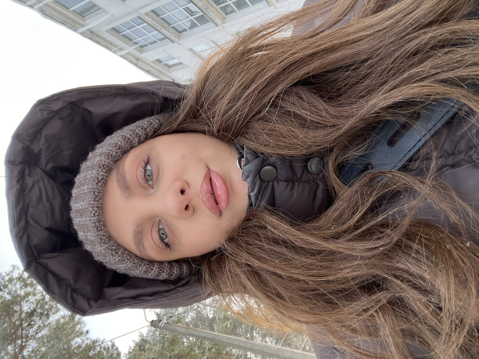 A young woman with light brown hair, wearing a gray knit hat and a dark puffer jacket with the hood up, poses close to the camera. Her eyes are light green, and her lips are full. The background features a blurred view of a building with many windows and a snowy landscape. The photo is taken from a low angle, with the camera tilted slightly.
