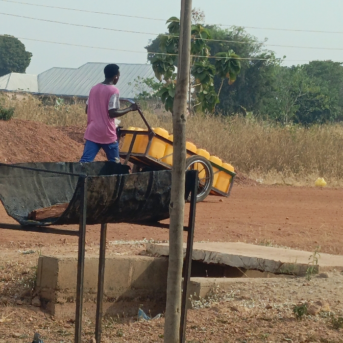 In Shendam, Nigeria, a male individual is observed from the rear, pushing a two-wheeled handcart laden with approximately ten to twelve yellow plastic jerrycans. The man wears a pink t-shirt with white sleeves and blue trousers. He is situated on an unpaved reddish-brown dirt path. In the immediate foreground, a dark, trough-shaped metal container rests on a black metal stand, partially obscured by a light-colored wooden utility pole. A concrete slab covers a drainage channel positioned below the metal stand. The environment consists of reddish-brown earth, dry, light-brown vegetation, and scattered green trees. In the mid-background, a large mound of reddish-brown dirt is visible. Further in the background, residential buildings with light-colored roofs are present under a clear sky. A small, crumpled yellow plastic item lies on the dirt path to the right in the mid-background.
