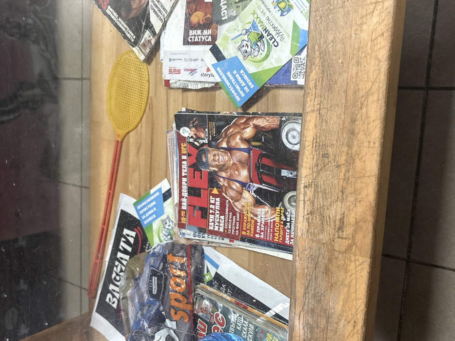 The scene displays an array of magazines and printed materials situated on a worn, light-brown wooden surface, likely a counter or shelf, in an indoor environment within Dimitrovgrad, Bulgaria