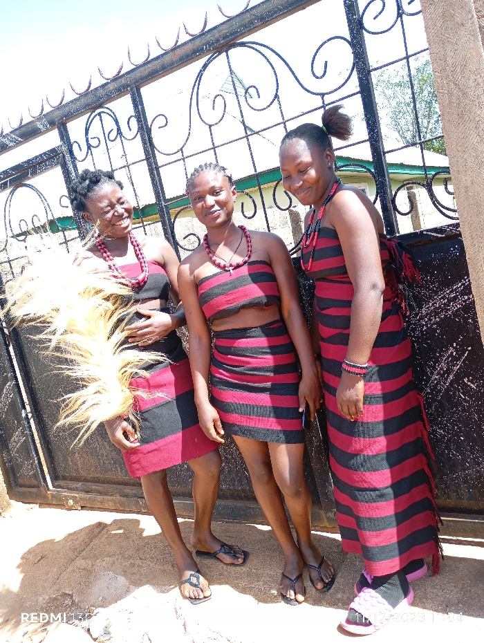 Three young adult females are depicted standing outdoors in Bahit, Nigeria. They are positioned in front of a decorative black wrought-iron gate. The ground is uneven, light brown earth. In the background, blurred light-colored building structures with green architectural elements are visible under a clear, bright sky. All three individuals are dressed in traditional-style attire featuring horizontal black and red stripes. The female on the left wears a strapless top and a knee-length skirt, accessorized with multiple red beaded necklaces. She holds a substantial, light-colored, feathery or fibrous object. Her facial expression displays pronounced laughter. She wears black flip-flops. The central female wears a strapless top and a mini-skirt, with red beaded necklaces, one featuring a dark cross pendant. She exhibits a subtle smile and wears black flip-flops. The female on the right wears a strapless top and an ankle-length skirt with fringed detailing. She has red beaded necklaces and a red beaded bracelet. Her hair is styled in a high ponytail. Her facial expression shows a gentle smile. She wears pink socks and pink slide sandals. The group appears to be posing for a photograph.