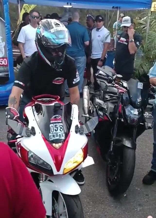 A motorcycle rider wearing a black t-shirt, blue jeans, black sneakers, a colorful helmet, and gloves sits on a red and white motorcycle. The motorcycle has the number 058 on its front. Another black motorcycle is parked to its right. Behind the rider, people stand around under a tent with "VPRacingFuels.com" printed on it. The area is paved. A person in a red shirt stands in the foreground, partially blocking the view. Several people are observing the rider and motorcycle.