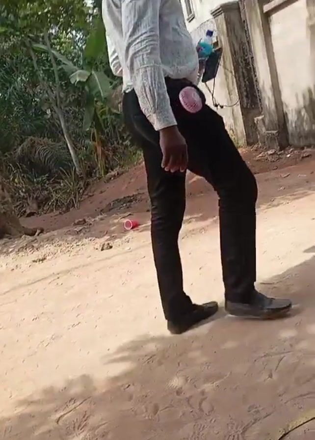 man walking on a dirt path towards a concrete wall. The man is wearing a light-colored button-down shirt, black pants, and black shoes. A small pink fan is attached to his belt. As the man walks away, two women in colorful skirts and blouses walk in the opposite direction, carrying purses. The background includes trees, a concrete wall topped with barbed wire, and a red plastic cup on the ground. The dirt path is covered in footprints.