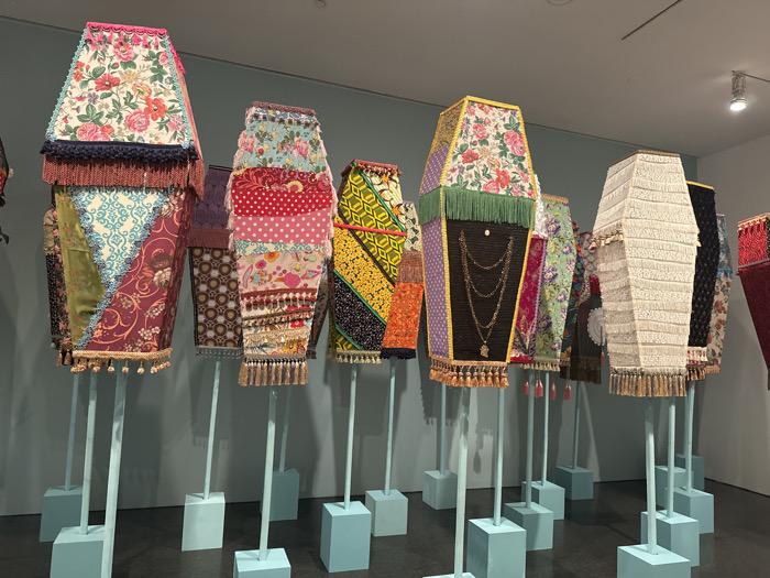 The image displays an art installation located within the Museu Picasso, Barcelona, Spain. The scene features approximately twenty textile-covered, coffin-shaped sculptures of varying sizes, standing upright. Each sculpture is unique, adorned with diverse fabric patterns including floral, polka dot, geometric, and abstract designs, often incorporating multiple textiles in a patchwork style. Embellishments such as fringes, tassels, ribbons, and decorative trims are consistently applied around the edges and divisions of the textile segments. One prominent sculpture, center-right, features multiple gold-colored necklaces draped across its dark, woven front surface. The sculptures are mounted on tall, slender, light blue poles rooted in cuboid bases of the same color, arranged in staggered rows on a dark grey floor. The background consists of a plain, light blue wall. A single recessed ceiling spotlight is visible in the upper right quadrant, providing illumination. No individuals are present in the frame.