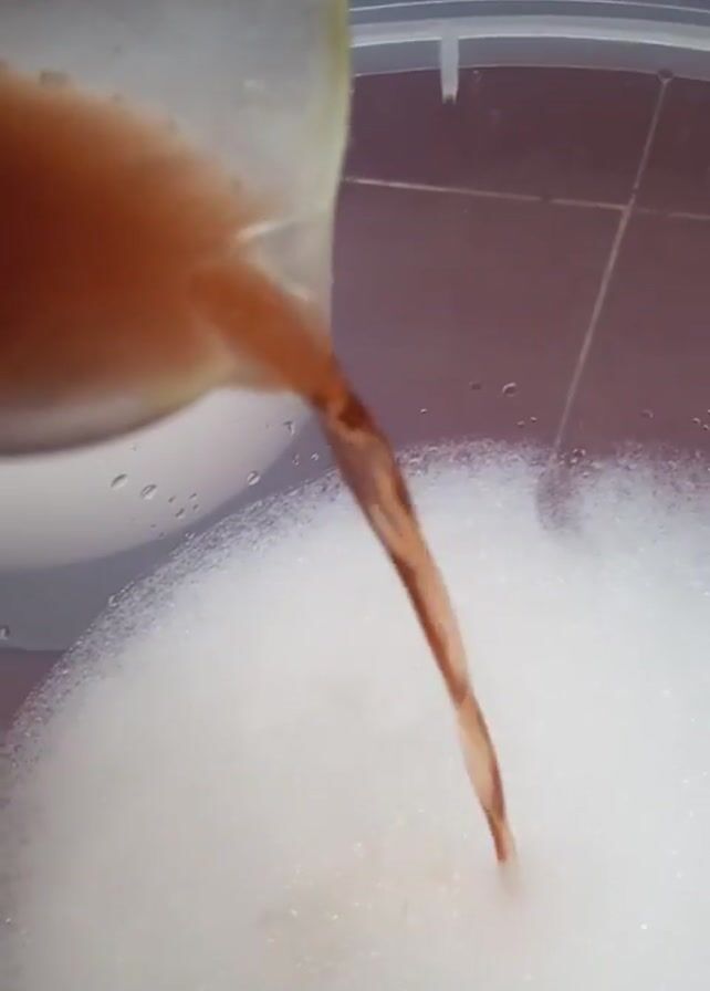 clear measuring cup being tilted to pour a thin, reddish-brown liquid into a container filled with white foam