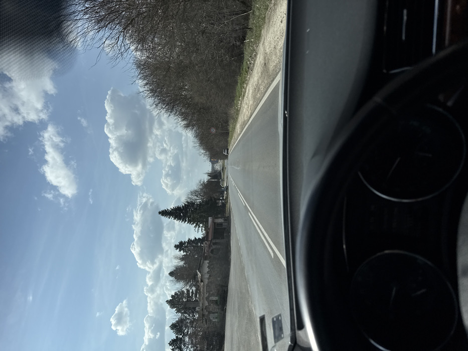 A forensic examination of the image reveals a daylight scene captured from the interior of a vehicle, looking forward along a paved road in the city of Unknown, Unknown. The foreground is dominated by the upper portion of a dark steering wheel and dashboard, partially obscuring the vehicle's instrument cluster. The lower edge of the windshield is visible, with minor glare. A patterned texture is present on the upper right side of the windshield area. The midground features a two-lane asphalt road with a solid double white line marking the center. A dirt and gravel shoulder runs along the right side of the road, where a circular speed limit sign, indicating "50," is visible. Further down the right shoulder, a white sedan is stationary or moving slowly. To the left of the road, a paved area leads to an older, single-story building constructed with stone and featuring a reddish roof, appearing to be a commercial or residential structure. Behind this building and further along the left side of the road, several tall coniferous trees and other deciduous trees with bare branches are present. Distant buildings and infrastructure suggest the presence of a town or village ahead. The background consists of a clear blue sky with scattered cumulus clouds. On the right, a dense line of bare deciduous trees borders the road, forming a natural barrier. The overall environment suggests a semi-rural or suburban setting. No individuals are visible in the scene.