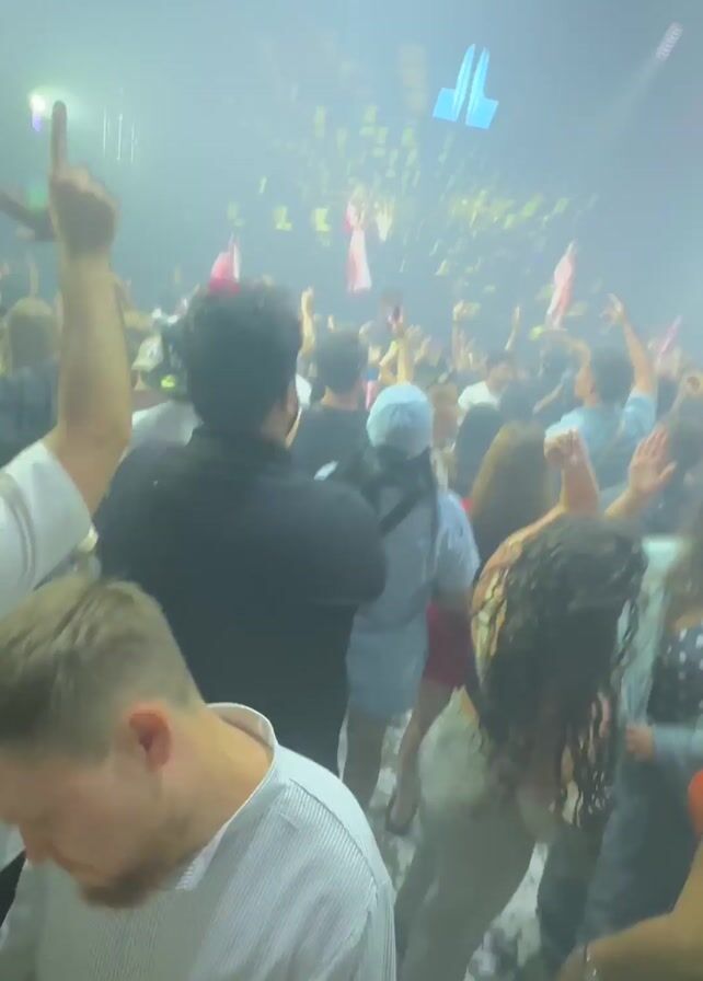 crowded concert venue with many people, their arms raised, enjoying the music. Confetti is falling from the ceiling, and stage lights illuminate the performers, whose identity is obscured. The environment is dark, but the stage lights create a vibrant atmosphere. Some individuals are holding up their phones.