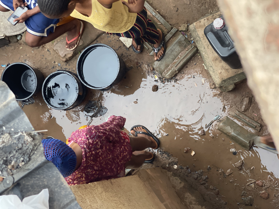 An overhead shot shows people near puddles of muddy water. Several black buckets, some filled with a dark liquid, are visible. Individuals wear casual attire, including shorts, t-shirts, and a maroon dress. Some have footwear like sandals or flip-flops. The surrounding area appears to be a concrete or stone-paved space, with a black canister and various debris scattered around.