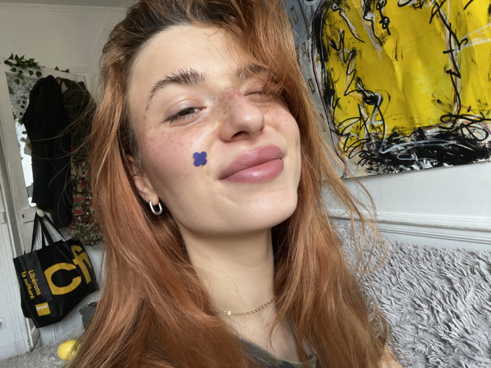 This image depicts a female individual in a medium close-up shot, located indoors in Ivry-sur-Seine, France. The subject has long, reddish-brown hair, fair skin with visible freckles across her nose and cheeks. A small, dark blue, four-petal flower-shaped sticker is positioned on her left cheek. She wears a silver hoop earring in her left ear and a thin golden chain necklace. Her left eye is partially closed, and her lips are slightly parted in a pout. The background on the left features a white doorframe or mirror frame, partially obscured by green artificial ivy. A dark garment hangs on a hook to the left of the frame. Below this, a black Fnac tote bag is visible, displaying yellow text that reads "Libérons la culture." A small, yellow, spherical object rests on the floor beneath the bag. On the right, an abstract artwork is mounted on a light-colored wall, characterized by a prominent yellow background with black and white scribbled lines and shapes. The bottom right foreground shows a textured, grey, fluffy material, likely a blanket or cushion.