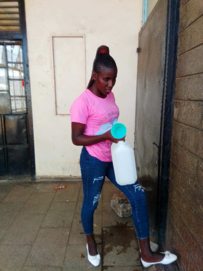 A young adult female, consistent with Kenyan ethnicity, stands in an outdoor paved area. She wears a pink short-sleeved t-shirt with a light graphic, blue distressed skinny jeans, and white ballet flats. Her hair is braided and styled into an elongated bun on top of her head. In her left hand, she holds a translucent white plastic jug, and in her right hand, she holds a turquoise plastic cup. She is looking downwards and slightly to her right. The ground is paved with rectangular grey tiles. To her left is a light-colored wall featuring a rectangular recessed panel, and further left, a dark-framed glass door or window with a grid pattern. To her right is a dark, textured wall, possibly constructed from brick or concrete block, with a prominent dark vertical frame. A small piece of orange debris is visible on the paved ground in the mid-left. The lighting indicates natural daylight. The specific location within Nairobi, Kenya, is not discernible from the visual evidence, but the scene is consistent with typical urban residential or mixed-use areas within the city.