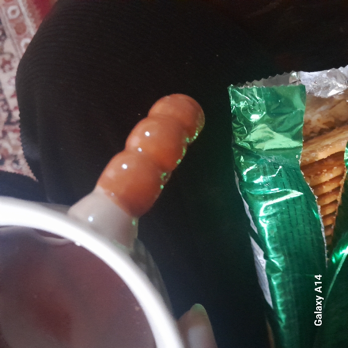A partially visible mug with dark liquid is on the left. Its handle has three rounded segments colored light brown. Next to it is an open green and silver foil package, revealing stacked crackers inside. A dark-colored surface or garment occupies the background. "Galaxy A14" is visible in the lower right corner of the frame. Part of a patterned surface is blurred on the top left corner.