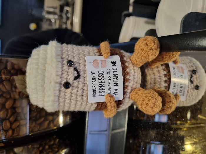 A crocheted plush toy, approximately 15cm in height, resembling a coffee cup with a white top, light beige middle section, and brown base, is positioned on a reflective dark surface in a coffee establishment located in South Kesteven, United Kingdom