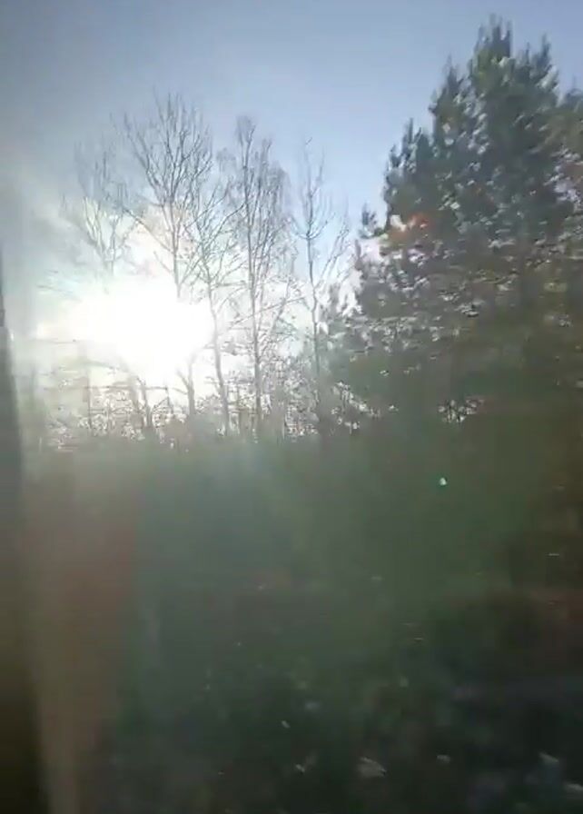 The video depicts a landscape of trees and vegetation under a bright sun, partially obscured by clouds. The sun creates a significant glare, impacting visibility. The foliage appears to be a mix of grasses and trees, with the trees mostly bare of leaves. The scene is filmed from a moving perspective, possibly from a vehicle. The sky is visible at the top, with a clear blue color evident through breaks in the cloud cover.