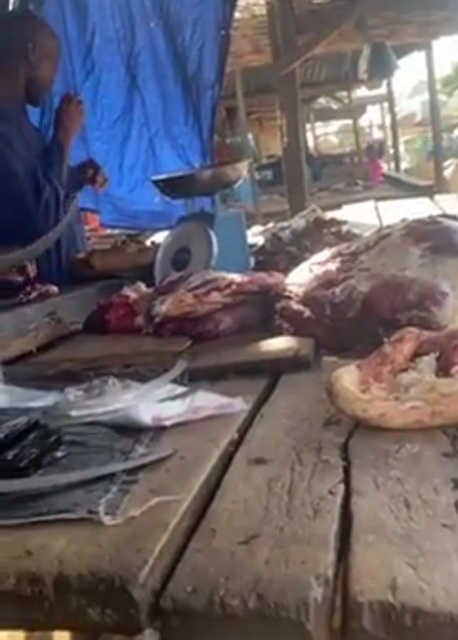 butcher stand at an outdoor market. Two men are working at the stand. One man is cutting pieces of raw meat, likely beef, with a large knife. The meat is on a rough, wooden table. The other man appears to be talking and gesturing. Behind them is a scale. A blue tarp provides some overhead cover. The environment appears to be a busy market scene.