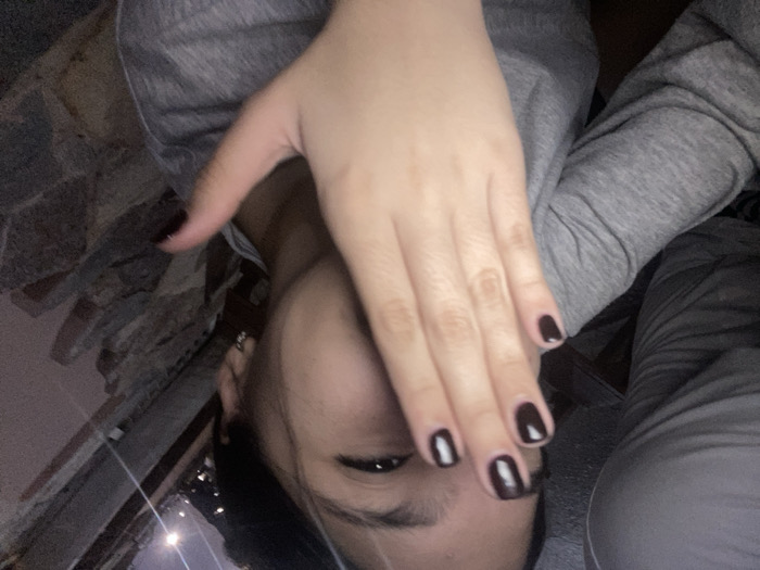 The scene, set in the city of Cotoperíz, Venezuela, depicts at least two individuals in a dimly lit, possibly outdoor or semi-outdoor, nighttime environment. A female subject occupies the majority of the frame, seen in a close-up. Her right hand, with fingernails painted a dark, possibly maroon or deep brown, color, covers her mouth and a portion of her nose. Her visible right eye is narrowed. She wears a gray long-sleeved shirt, with a lighter garment visible beneath. A small, reflective stud earring is present on her right earlobe. Her left hand, also with dark-painted fingernails, is partially visible at the bottom right. To the left, a partial view of a second individual's torso and arm is visible, clad in a light gray long-sleeved shirt. The background on the right features a textured stone wall construction. Overhead, a dark sky with a visible distant street light indicates a nighttime setting.