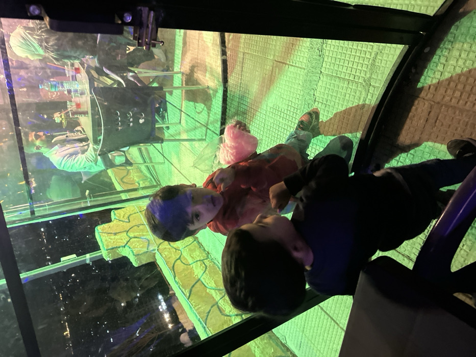 Two children, one in a red shirt and the other in a dark shirt, are on a glass floor
