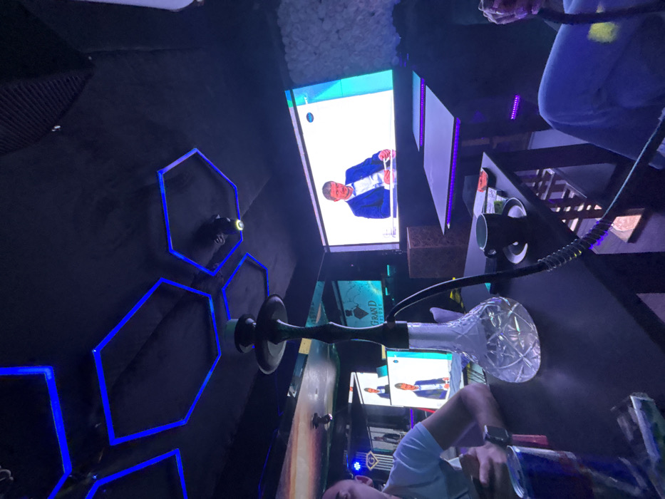 An indoor scene within a lounge or bar in Sevlievo, Bulgaria, is depicted. The environment features a dark ceiling with blue LED hexagonal light fixtures. Below, a prominent hookah with a clear, faceted glass base and a dark stem stands on a black table in the foreground. To its left, a partial view of an individual in a light-colored t-shirt shows them holding a mobile phone and a blue/red beverage can. To the right of the hookah, a black mug rests on a saucer, accompanied by a mobile phone with an orange back and other small items on the table. The lower body and legs of a second individual, wearing blue jeans, are visible on the right side of the frame, holding a black hookah hose. Multiple large display screens are integrated into the walls. The largest screen on the right prominently displays a man in a blue suit jacket, seated at a table against a plain white background, appearing to be engaged in an interview or presentation. Another screen in the background features a "GRAND" logo and also shows the same man in blue, along with reflections of other similar screens. The overall lighting is dim, accentuated by the blue LED elements and the bright screens.