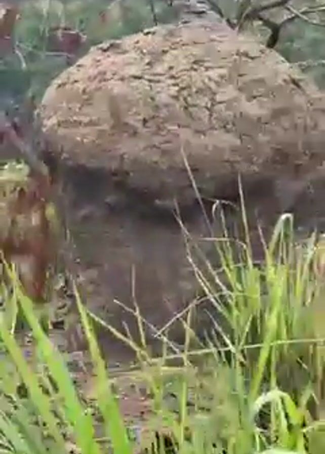 large, lumpy, gray-brown termite mound in a natural setting, likely a forest or jungle
