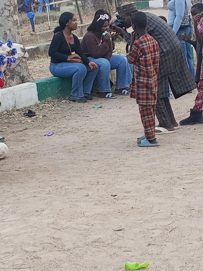 Two women sit on a low concrete bench, casually dressed in jeans and tops. One eats something from a container. A man in a patterned suit stands near them, seemingly interacting with a child in a plaid outfit. Additional people stand to the side and behind. The scene occurs outdoors on a dirt ground with debris scattered around. A concrete structure is visible in the background.