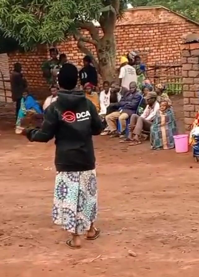 The scene depicts a meeting in what appears to be a rural area, possibly a village. A woman in a black hoodie with "DCA" printed on it and a patterned skirt is standing in the center of a dirt courtyard and addressing a group of people seated on chairs or on the ground. There are approximately 20-25 people present, including women, men, and children. Most of the women are wearing headscarves. Several brick buildings with corrugated iron roofs surround the courtyard. Some individuals are standing in the background behind the seated group. There is a tree providing some shade to the seated people. The speaker is gesturing with her hands. The overall atmosphere is informal and conversational.
