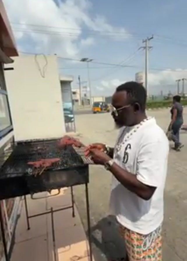 A middle-aged man with a beard and sunglasses, wearing a white t-shirt, colorful shorts, and a silver chain necklace, is grilling meat skewers on a charcoal grill outside. He holds a skewer in his hand and places it on the grill. The grill is positioned next to a small building with a white exterior. In the background, a road with vehicles, including a yellow tricycle, is visible under a partly cloudy sky.