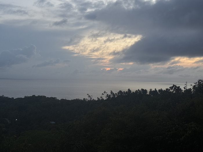The image displays an elevated panoramic view in Tambon Ko Tao, Thailand, captured during twilight hours. The sky occupies the upper portion, characterized by extensive, dark grey cloud cover. A horizontal band of lighter clouds along the horizon exhibits subtle yellow and orange light, indicative of either sunrise or sunset. Below the horizon, the ocean extends across the mid-ground, appearing as a calm, uniform dark grey-blue surface. The lower half of the frame is dominated by a densely forested hillside, comprising dark green tropical foliage with numerous palm trees silhouetted along its crest. A small, intense white light source is visible within the dark forest on the lower-left side. A faint, dark, geometric structure is minimally discernible amidst the central-right foliage. On the far right, a thin, dark vertical structure, likely an antenna or tower, protrudes above the treeline. No human subjects, animals, or explicit activities are present.