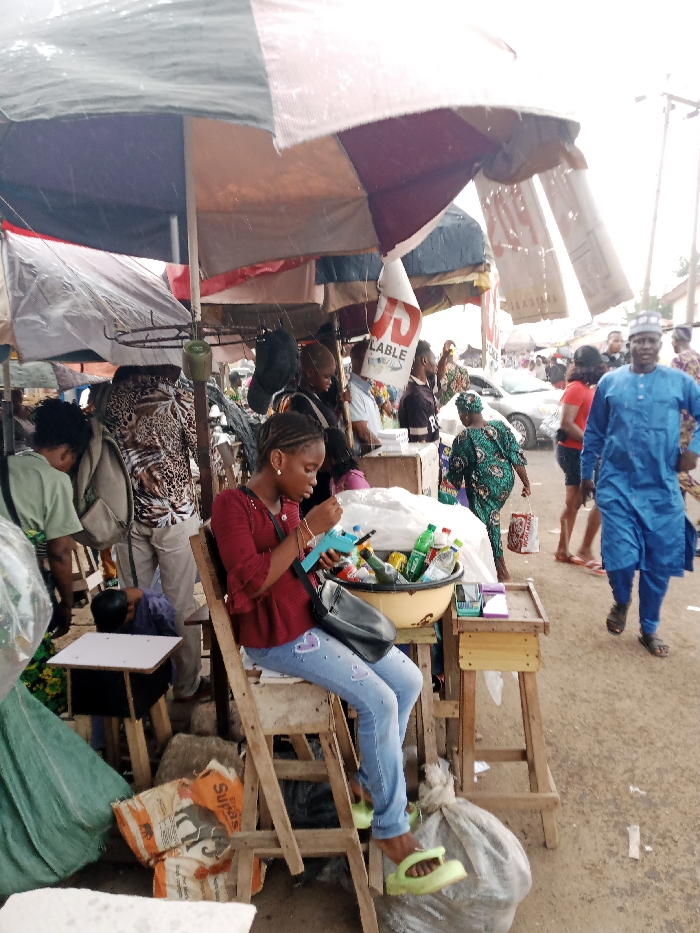 The image depicts an outdoor market scene in Iju, Nigeria, under an overcast sky with visible rainfall. In the foreground, a young woman with braided hair, wearing a maroon top, light blue jeans with faded heart patterns, and lime green slide sandals, sits on a tall, light-brown wooden stool. She holds a light blue object, possibly a crafting tool, in her right hand, appearing to be focused on it. A black shoulder bag hangs on her left side. Adjacent to her, a yellow plastic basin filled with various bottled beverages and other items rests on a wooden stand. To the right of the basin, a small purple and white electronic device, likely a payment terminal, is present on the stand. Below her feet, on the unpaved dirt ground, a gray plastic bag and a partially visible "SUPAS" branded cement bag are observed. The upper portion of the frame is dominated by multiple large, multi-colored fabric umbrellas, some showing signs of wear and tears, providing cover for various vendor stalls. A white banner with a red "D" logo and the partial text "ABLE" hangs from one of these umbrellas. In the mid-ground, several individuals are visible. To the left, a person in a leopard-print shirt stands facing away, and another in a green top is partially visible. To the right, a man in a blue agbada (traditional attire) and a skullcap walks towards the viewer's right, looking towards the camera. Further behind him, a woman in a green patterned dress walks away, carrying a white bag, and another woman in a red shirt is visible near a light-colored sedan in the background. The scene portrays an active market environment with multiple individuals engaged in commercial and pedestrian activity.