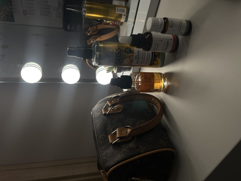 An interior scene depicts a vanity or dressing table in what is likely a private residence or accommodation within Sofia, Bulgaria, as indicated by product labels in Cyrillic script. The primary subjects are a collection of personal care products and a handbag arranged on a light gray surface. On the far left, a brown Louis Vuitton monogrammed handbag, approximately cylindrical with two tan leather handles and a visible zipper, rests with its front facing the viewer. Adjacent to the handbag, from left to right, are four bottles. The first is a clear glass bottle with an amber liquid and a black pump dispenser, its reverse label visible. Next, a taller clear plastic spray bottle contains a light blue liquid, identified by its label as "Schwarzkopf GLISS OIL NUTRITIVE EXPRESS REPAIR CONDITIONER" for "Heavily damaged hair." To its right is a small, dark brown glass dropper bottle, labeled in Cyrillic as "Рициново масло" (Castor oil) and "РИЦИН" (RICIN), with a volume of 30 ml. The fourth and smallest bottle, white with a white screw cap, is labeled in Cyrillic as "Етерично масло" (Essential oil) and "РОЗМАРИН" (ROSEMARY), indicating a rosemary essential oil of 10 ml. The background features a large rectangular mirror, on the left edge of which are three vertically aligned, round, illuminated vanity lights emitting bright white light. The mirror reflects parts of the bottles, a small potted succulent plant positioned behind the Gliss conditioner, and a faint reflection of a white calendar on a wall in the upper right quadrant of the reflection. The overall environment suggests a space dedicated to personal grooming or daily preparations.