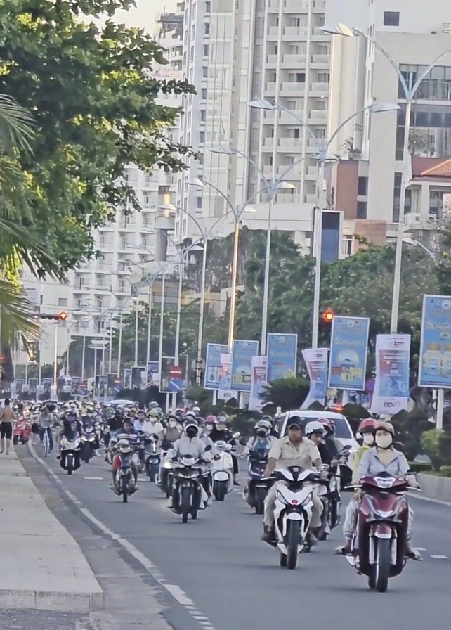 street in a city, apparently in Vietnam, with dense traffic of motorbikes and scooters moving in the same direction