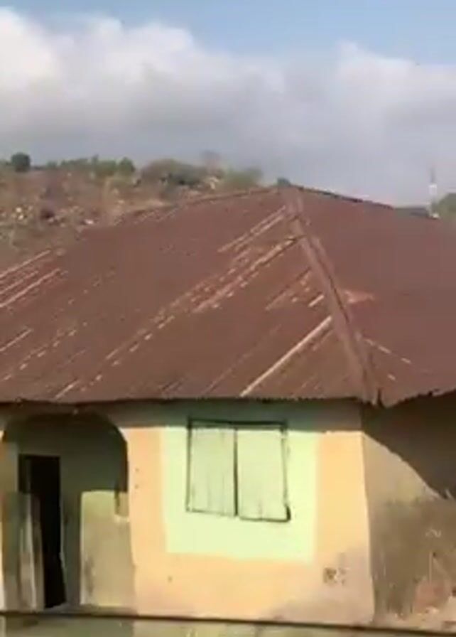 view from a moving vehicle passing by buildings and landscapes. Initially, it shows a dilapidated concrete structure with a partially collapsed roof. The scene then shifts to show a group of simple houses with rusty metal roofs, situated against a backdrop of a hill covered in vegetation. As the vehicle continues moving, the view transitions to lush greenery and trees. Toward the end, the video captures a glimpse of a person's head briefly appearing in the frame, looking out from the vehicle.