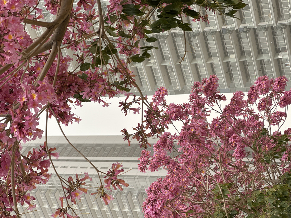 - "An outdoor, vertically oriented image captures a dense display of pink-flowering tree branches in the foreground, set against a backdrop of modern high-rise buildings under an overcast sky in Tel Aviv-Yafo, Israel" by FM-jqiIm2, licensed under CC BY 4.0