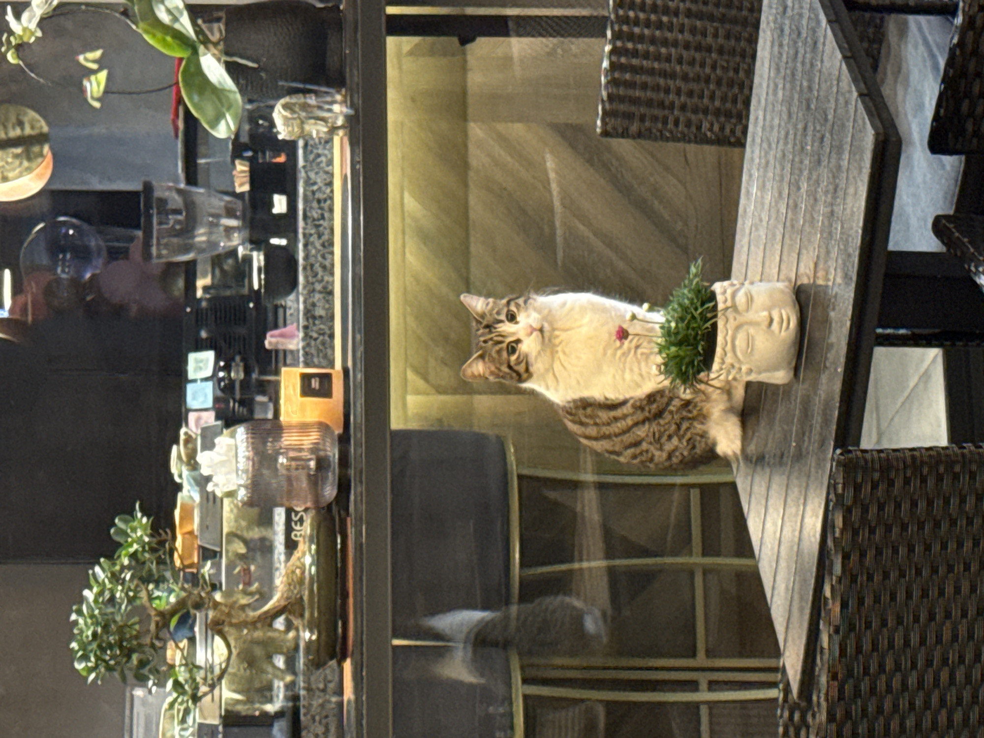 The image depicts the interior of a cafe in Varna, Bulgaria. A domestic cat is the central subject, positioned in the midground, seated upright, and facing the viewer. The cat displays a white chest, belly, and paws, contrasting with tabby-patterned fur in shades of brown and grey on its back, head, and tail. Its eyes are open and directed forward. In the foreground, a dark-colored, slatted rectangular table is visible, surrounded by dark brown wicker-style chairs, partially cropped. On the table, a light-colored ceramic planter, shaped as a human head with a serene expression, contains a small green plant with a single pink flower bud. Behind the cat, a textured wall with subtle horizontal and diagonal patterns in a muted beige or light brown tone is visible, illuminated by an unseen light source creating a soft glow. Further behind, separated by what appears to be a glass partition or counter, a cafe bar area is discernable. This area features a granite or stone counter holding various objects: a bonsai tree in a dark pot, a ribbed glass jar containing white items, a yellow-orange candle in a container, a coffee grinder, parts of an espresso machine, clear glass containers, and another potted plant (likely an orchid). Reflections are evident on the glass partition, indicating artificial lighting or reflections from the ceiling. The overall scene suggests a calm, indoor setting within a commercial establishment.