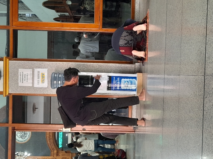 Inside a mosque, a man in black clothes and barefoot fills a bottle at a water dispenser. Other people are praying in the background, some visible through a wooden-framed window or doorway. Signs on the wall near the water dispenser in Indonesian indicate "Area Diawasi CCTV" and emphasize the importance of cleanliness in the mosque area. The tiled floor is grey and patterned.
